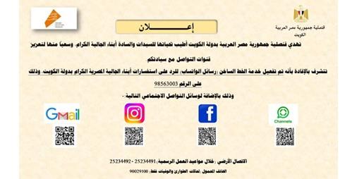 القنصلية المصرية بالكويت: تفعيل خدمة الخط الساخن 98563003 رسائل الواتساب للرد على استفسارات أبناء الجالية