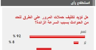 وأيد 88% من القراء مطالب تكثيف حملات المرور على الطرق للحد من الحوادث بسبب السرعة الزائدة، بينما رفض 12% مطالب تكثيف حملات المرور على الطرق للحد من الحوادث بسبب السرعة الزائدة.