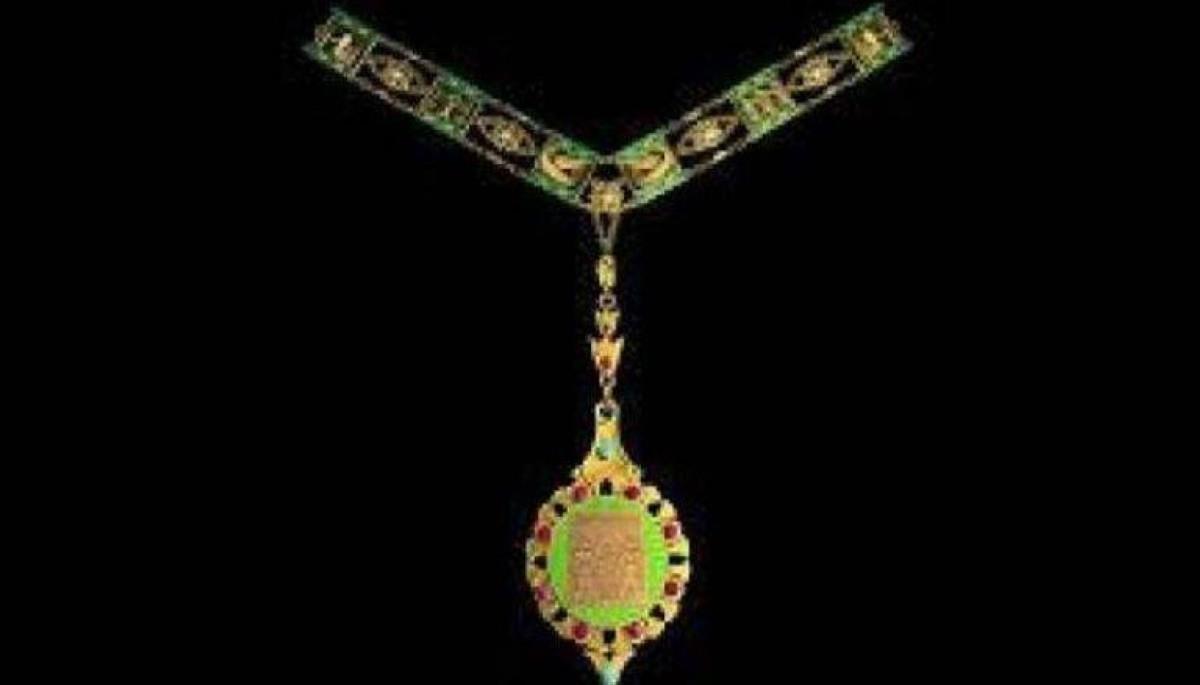 القلادة عبارة عن سلسلة تتعاقب فيها ثلاث وحدات مربعة الشكل، كل وحدة منها مُحلاة بالميناء وبرموز فرعونية، وتتصل الوحدات ببعضها من الأركان بسلسلتين متوازيتين، يتوسط كل سلسلة منهما زهرة لوتس صغيرة، وتتكرر الوحدات الثلاث على النحو الآتي: الأولى: ترمز إلى حماية البلاد من الشرور، والثانية: ترمز إلى الرخاء والسعادة التي يجلبها النيل، الثالثة: ترمز إلى الخير والدوام.