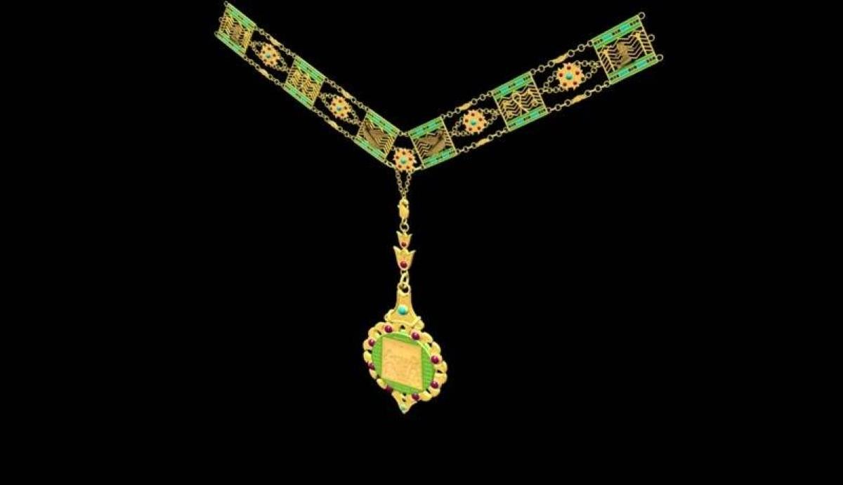 مم تصنع؟تُصنع القلادة من الذهب الخالص أو الفضة المذهّبة، وتستوحي تصميمها من التراث الفرعوني، إذ تتألف من وحدات مزخرفة بالمينا الملوّنة، تتصل ببعضها عبر سلاسل تتخللها زهور اللوتس، رمز النقاء والخلود في الحضارة المصرية، وفي وسطها تتدلى ميدالية كبيرة تمثل وحدة نهر النيل، مصدر الحياة لمصر على مر العصور.