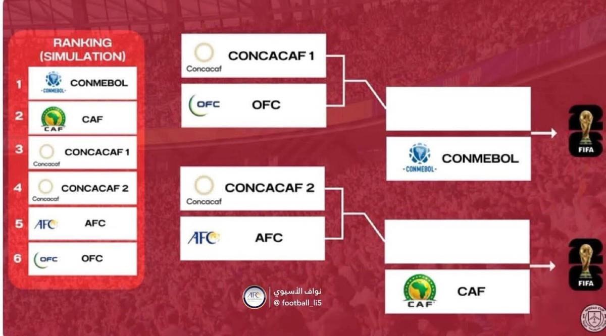 وتم تقسيم المنتخبات بحسب تصنيف الفيفا: حيث سيلعب ملحق آسيا مع منتخب أمريكا الشمالية ((الأقل تصنيفا))، الفائز منهما يلعب ضد المتأهل من ملحق إفريقيا أو أمريكا الجنوبية ((حسب التصنيف))، الفائز من المواجهتين يتأهل مباشرة إلى كأس العالم..