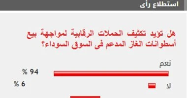 وأيد 94% من القراء مطالب تكثيف الحملات الرقابية لمواجهة بيع أسطوانات الغاز المدعم فى السوق السوداء، بينما رفض 6% مطالب تكثيف الحملات الرقابية لمواجهة بيع أسطوانات الغاز المدعم فى السوق السوداء.
