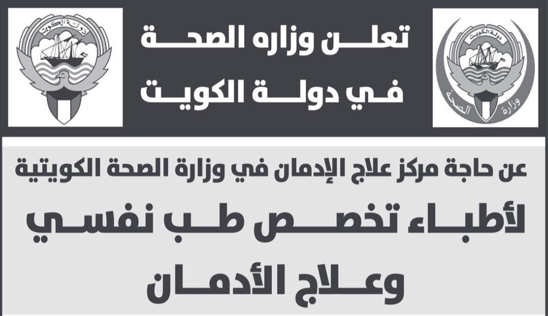 تعلن وزارة الصحة في دولة الكويت عن حاجة مركز علاج الإدمان في وزارة الصحة الكويتية لأطباء تخصص طب نفسي وعلاج الإدمان.