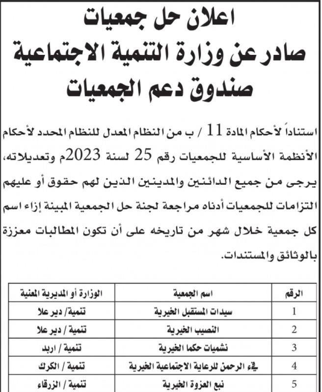 دعت وزارة التنمية الاجتماعية/صندوق دعم الجمعيات، جميع الدائنين والمدينين للجمعيات التي تم الإعلان عن حلّها، إلى مراجعة لجان حل وتصفية الجمعيات المدرجة أسماؤها، وذلك من أجل تسوية الحقوق المالية أو الالتزامات المترتبة عليهم.