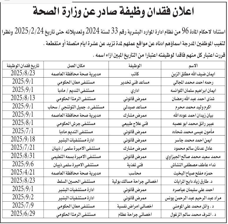 أعلنت وزارة الصحة عن فقدان عدد من الموظفين لوظائفهم، وذلك استناداً لأحكام المادة (96) من نظام إدارة الموارد البشرية رقم (33) لسنة 2024 وتعديلاته حتى تاريخ 24 فبراير 2025، وذلك بسبب التغيب غير المبرر عن مواقع العمل لمدة تزيد عن عشرة أيام، سواء كانت متصلة أو متقطعة.