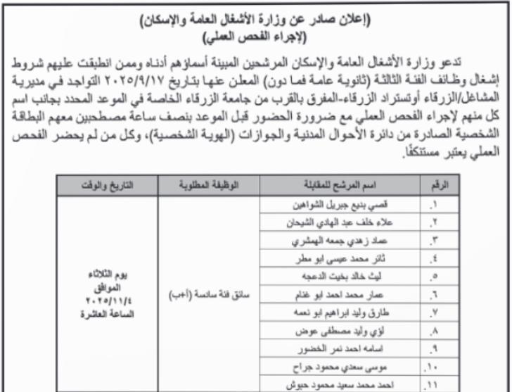 (MENAFN- Al Wakeel News) الوكيل الإخباري- تدعو وزارة الأشغال العامة والإسكان المرشحين التالية أسماؤهم ممن انطبقت عليهم الشروط لإجراء الفحص العملي.