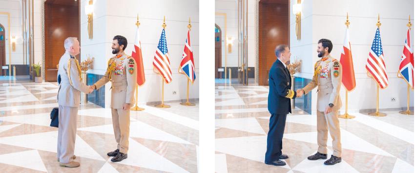 وجرى الاجتماع بحضور سمو الفريق الركن الشيخ ناصر بن حمد آل خليفة مستشار الأمن الوطني قائد الحرس الملكي الأمين العام لمجلس الدفاع الأعلى، ورئيس أركان الدفاع البريطاني الفريق أول جوي السير ريتشارد نايتون، وقائد القيادة المركزية الأمريكية الأدميرال براد كوبر.