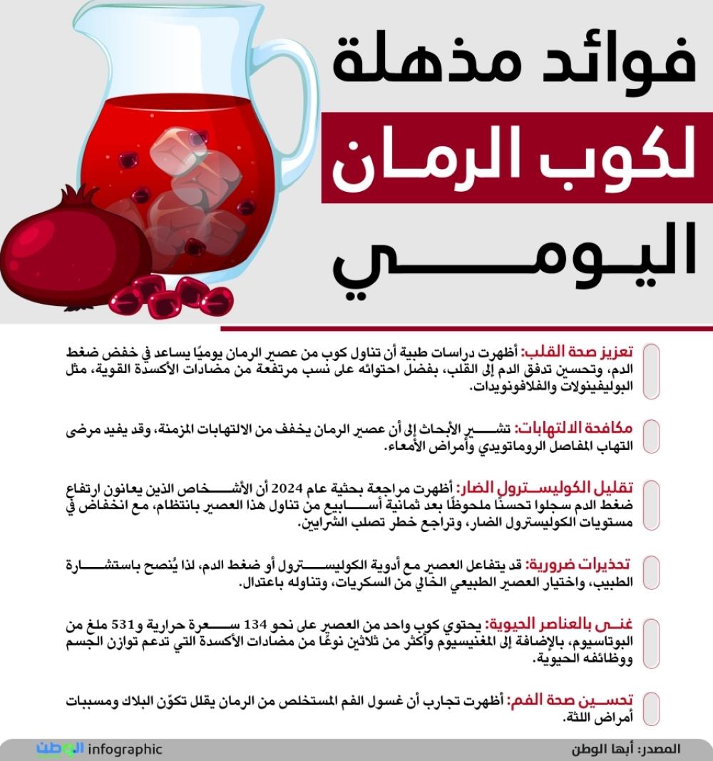 (MENAFN- Al Watan) . تعزيز صحة القلب: أظهرت دراسات طبية أن تناول كوب من عصير الرمان يوميًا يساعد في خفض ضغط الدم، وتحسين تدفق الدم إلى القلب، بفضل احتوائه على نسب مرتفعة من مضادات الأكسدة القوية، مثل البوليفينولات والفلافونويدات.
