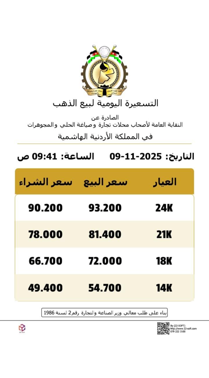 كما بلغت أسعار الغرام الواحد من الذهب عيارات 24 و18 و14 لغايات البيع من محلات الصاغة عند 93.20 و72 و54.70 دينارا على التوالي.