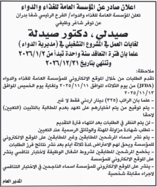 تعلن المؤسسة العامة للغذاء والدواء – الفرع الرئيسي في شفا بدران، عن توفير شاغر وظيفي بمسمى: صيدلي / دكتور صيدلة لغايـات العمـل في المشـروع التشغيلي (مديرية الدواء)،