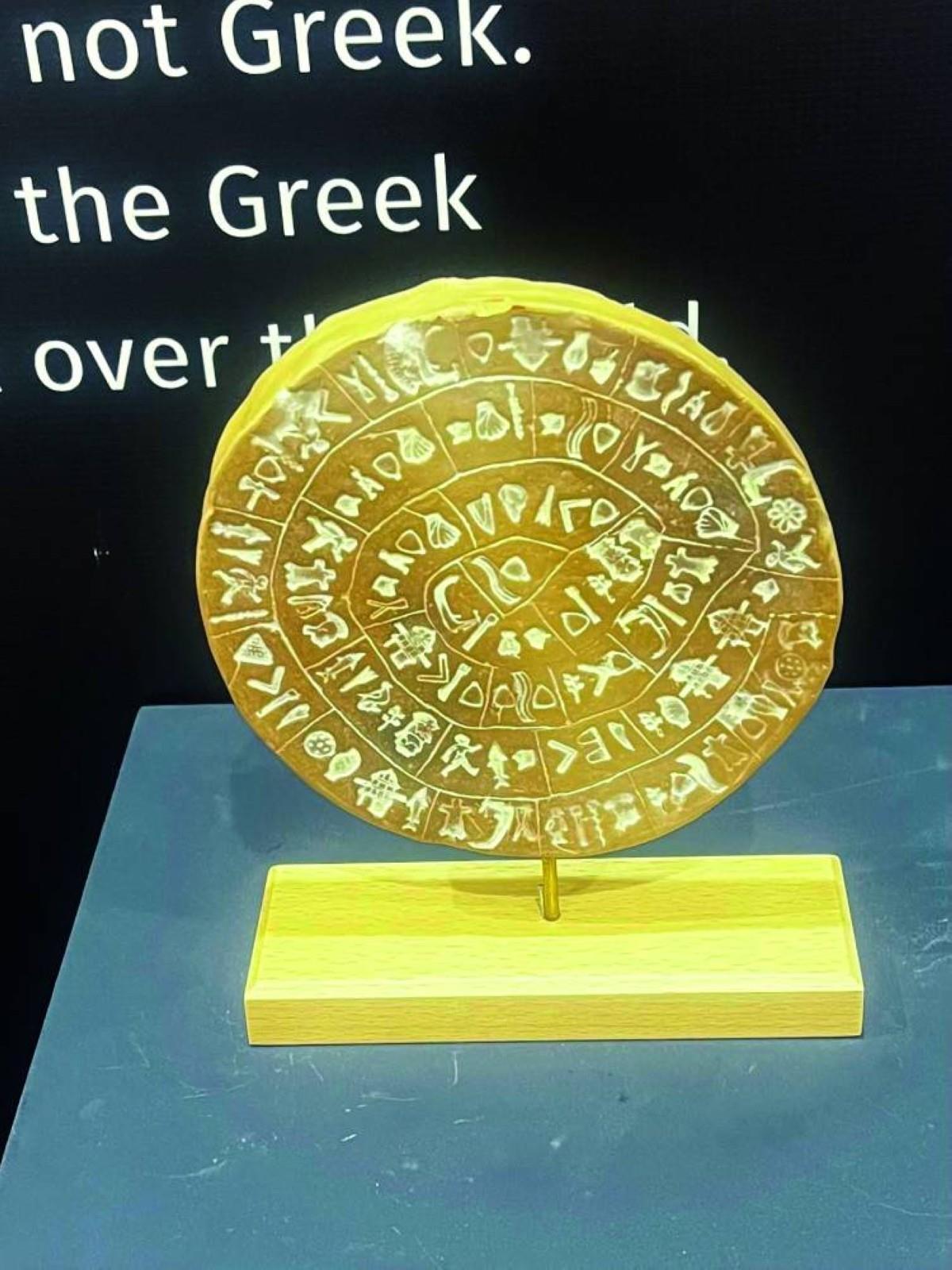 هذا القرص الذي يُعرض بجناح اليونان، ضيف شرف الدورة الـ 44 لمعرض الشارقة الدولي للكتاب، يسمى قرص ((فايستوس)) اكتشفه عالم الآثار الإيطالي فيديريكو هالبهير بقصر فايستوس المينوي بجزيرة كريت عام 1908.