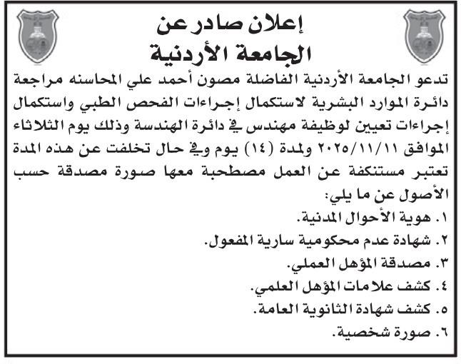 (MENAFN- Al Wakeel News) الوكيل الإخباري- تدعو الجامعة الأردنية الفاضلة مصون أحمد علي المحاسنة مراجعة دائرة الموارد البشرية لاستكمال إجراءات الفحص الطبي واستكمال إجراءات تعيينها لمهندس في دائرة الهندسة، وذلك اليوم الثلاثاء الموافق 11/11/2025، ولمدة (14) يوماً.