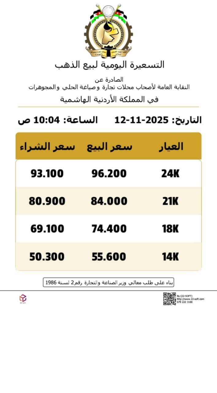 وبحسب التسعيرة فقد بلغ سعر غرام الذهب من عيار 21 "الأكثر تداولاً بين المواطنين 84.00 دينار، فيما بلغ سعر الشراء 80.900 دينار.