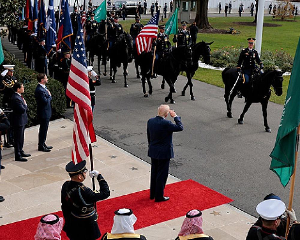 وحظي بن سلمان باستقبال استثنائي عند وصوله إلى البيت الأبيض، تضمن عرضا جويا بمقاتلات "إف-35" وآخر للخيول، في علامة على تعافي العلاقات بين البلدين بعد توتر شديد كان سببه مقتل خاشقجي.