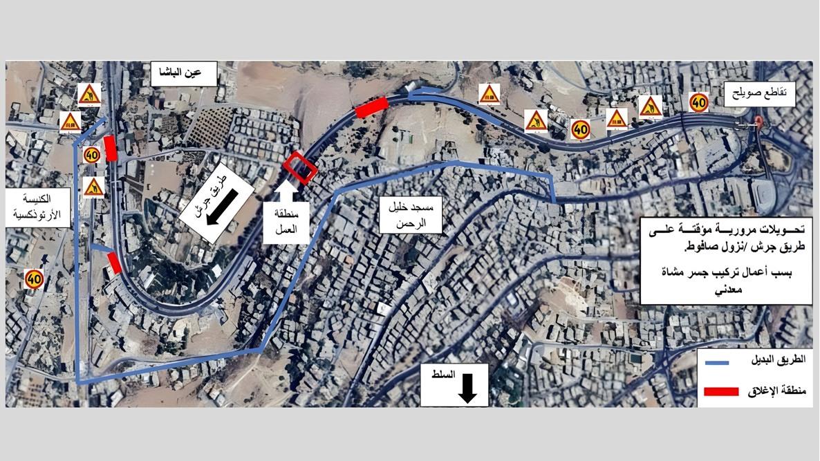 وأوضحت الوزارة في بيان، أن الأعمال تتطلب إغلاق الطريق بالكامل في الاتجاهين خلال فترة التنفيذ، مع تحويل حركة السير للقادمين من دوار صويلح باتجاه شارع إبراهيم زيادة، وتحويل السير للقادمين من دوار عين الباشا باتجاه صويلح إلى شارع كناز بن الحسين قرب الكنيسة الأرثوذكسية.