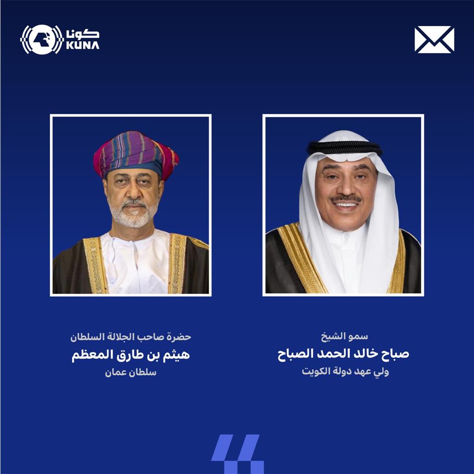الكويت - 20 - 11 (كونا) -- بعث سمو ولي العهد الشيخ صباح خالد الحمد الصباح حفظه الله ببرقية تهنئة إلى أخيه حضرة صاحب الجلالة السلطان هيثم بن طارق المعظم سلطان عمان الشقيقة ضمنها سموه خالص تهانيه بمناسبة الذكرى الخامسة والخمسين للعيد الوطني لسلطنة عمان الشقيقة.