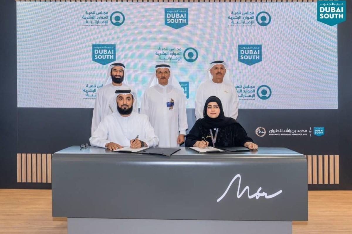 وبحضور معالي سلطان بن سعيد المنصوري رئيس مجلس تنمية الموارد البشرية الإماراتية في دبي، وخليفة الزفين الرئيس التنفيذي لمؤسسة مدينة دبي للطيران ودبي الجنوب، تم توقيع المذكرة عن ((دبي الجنوب)) حفصة القرقاوي المدير التنفيذي - الموارد البشرية، وعن المجلس عبد العزيز الفلاحي مشرف عام عمليات التوظيف، حيث أقيمت مراسم التوقيع في جناح دبي الجنوب في معرض دبي للطيران، بحضور عدد من كبار المسؤولين والخبراء من الجانبين، ما يعكس أهمية هذا التعاون، الذي يمثل نموذجاً للتكامل بين القطاعين العام والخاص، لدعم توجهات الإمارة نحو إعداد كفاءات وطنية قادرة على قيادة المستقبل في المجالات ذات الأولوية.