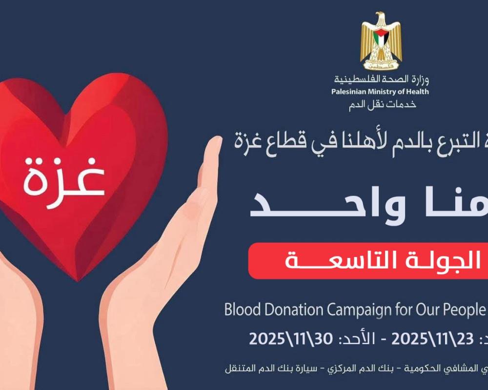 وتبدأ الجولة التاسعة من الحملة صباح يوم غد الأحد 23/11/2025، وحتى مساء الأحد المقبل 30/11/2025، من الساعة الثامنة صباحاً وحتى الثامنة مساءً، في كافة بنوك الدم التابعة للمستشفيات الحكومية، وبنك الدم المركزي برام الله، إضافة إلى سيارة بنك الدم المتنقلة، وذلك لتسهيل وصول المواطنين وضمان توفير الكميات اللازمة لدعم الاحتياجات اللازمة.