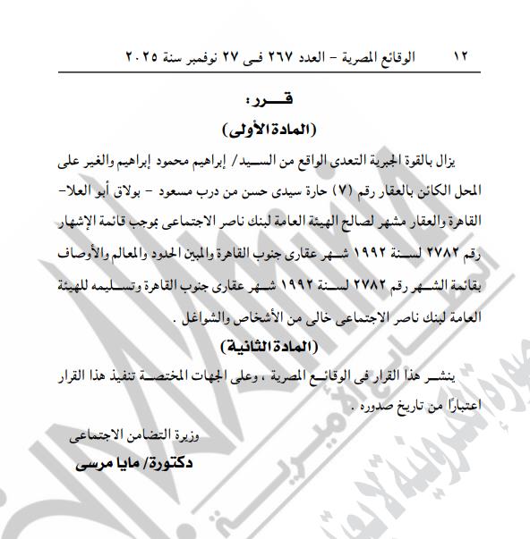 قرار الجريدة الرسمية كما نص القرار الثاني رقم 919 لسنة 2025 على إزالة التعديا الواقعة من قبل مواطنين على محل بالعقار رقم 17 بمنطقة حدائق القبة بالقاهرة، والمشهر لصالح بنك ناصر بموجب مستندات قانونية مسجلة منذ عام 1965، على أن يتم تسليم الموقع خاليًا بالكامل للهيئة.