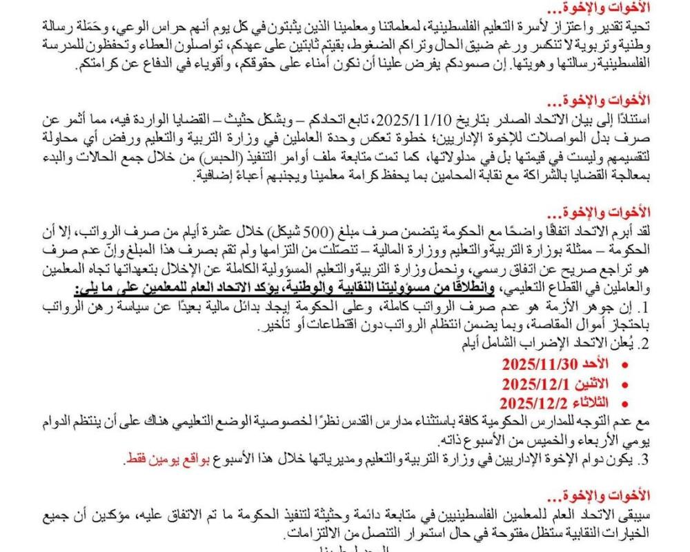 (MENAFN- Palestine News Network ) رام الله /PNN/ أعلن الاتحاد العام للمعلمين الفلسطينيين، اليوم، عن سلسلة خطوات احتجاجية تشمل إضراباً شاملاً لمدة ثلاثة أيام في المدارس الحكومية، وذلك عقب ما وصفه الاتحاد بـ"تنصل الحكومة من اتفاق مُبرم" يقضي بصرف مبلغ 500 شيكل لموظفي القطاع التعليمي خلال عشرة أيام من صرف الرواتب.
