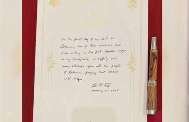 ترك البابا ليو الرابع عشر، الأحد، رسالة بسجل الشرف في القصر الرئاسي اللبناني.