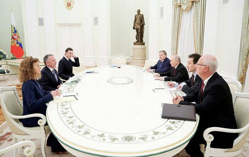 وقال‭ ‬الناطق‭ ‬باسم‭ ‬الرئاسة‭ ‬الروسية‭ ‬دميتري‭ ‬بيسكوف‭ ‬في‭ ‬مؤتمره‭ ‬الصحفي‭ ‬اليومي‭ ‬الذي‭ ‬حضرته‭ ‬وكالة‭ ‬فرانس‭ ‬برس‭: ‬‮«‬نقدّر‭ ‬جهود‭ ‬إدارة‭ ‬ترامب‭ ‬وما‭ ‬زلنا‭ ‬على‭ ‬استعداد‭ ‬لعقد‭ ‬لقاءات‭ ‬بالمقدار‭ ‬اللازم‭ ‬من‭ ‬المرات‭ ‬للوصول‭ ‬إلى‭ ‬تسوية‭ ‬سلمية‮»‬‭. ‬وتوجّه‭ ‬ويتكوف‭ ‬وكوشنر‭ ‬إلى‭ ‬موسكو‭ ‬مع‭ ‬نسخة‭ ‬محدّثة‭ ‬لخطة‭ ‬أمريكية‭ ‬لوضع‭ ‬حد‭ ‬للنزاع‭ ‬بعد‭ ‬محادثات‭ ‬بين‭ ‬واشنطن‭ ‬وكييف‭. ‬وأفاد‭ ‬بيسكوف‭ ‬بأن‭ ‬الجانب‭ ‬الروسي‭ ‬عبّر‭ ‬عمّا‭ ‬يعتبره‭ ‬‮«‬غير‭ ‬مقبول‮»‬‭. ‬وقال‭: ‬‮«‬إنها‭ ‬عملية‭ ‬عادية‭.. ‬كانت‭ ‬تلك‭ ‬أول‭ ‬مرة‭ ‬يجري‭ ‬فيها‭ ‬تبادل‭ ‬مباشر‭ ‬للآراء‮»‬‭.‬
