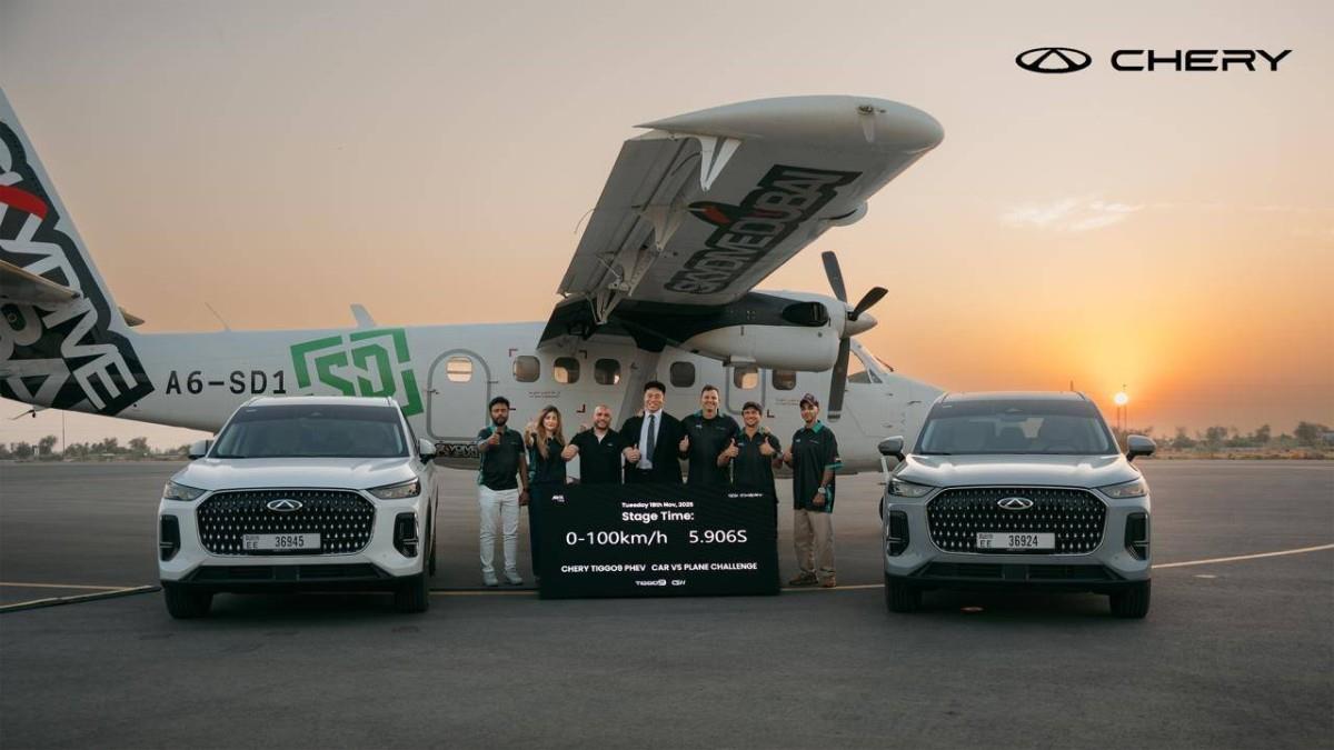شيري تيغو 9 سي إس إتش تجتاز تجربة "السيارة مقابل الطائرة" في سكاي دايف دبي