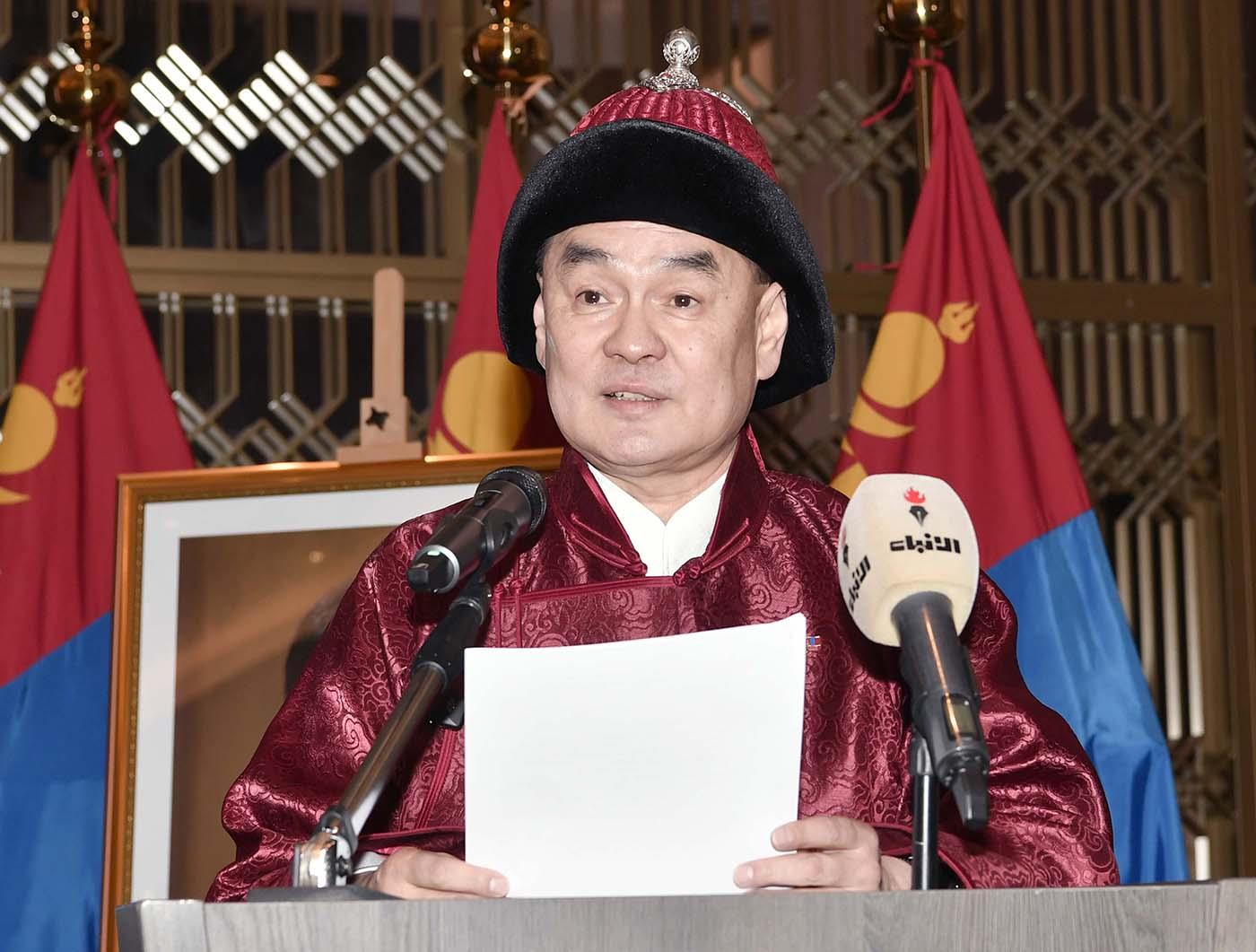 جاء ذلك في كلمة ألقاها في حفل استقبال نظمته السفارة اليوم الاحد بمناسبة اليوم الوطني المنغولي والذكرى الخمسين للعلاقات الدبلوماسية بحضور مساعد وزير الخارجية لشؤون آسيا السفير جوهر حيات وعدد من كبار المسؤولين وأعضاء السلك الدبلوماسي.