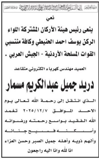 ينعى رئيس هيئة الأركان المشتركة اللواء الركن يوسف أحمد الحنيطي، وكافة منتسبي الجيش، العميد المتقاعد دريد جميل مسمار الذي انتقل إلى رحمة الله تعالى.