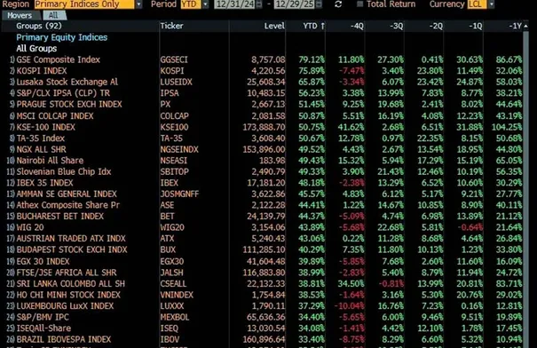 (MENAFN- Al Wakeel News) الوكيل الإخباري- صنفت وكالة بلومبرغ العالمية سوق عمان المالي في المرتبة الثالثة عشرة عالميًا من حيث الأداء منذ بداية العام الماضي 2025 وحتى نهايته، بعد أن حقق ارتفاعًا بنسبة أكثر من 45 بالمئة وفق بيانات مؤشرات الأسواق العالمية.