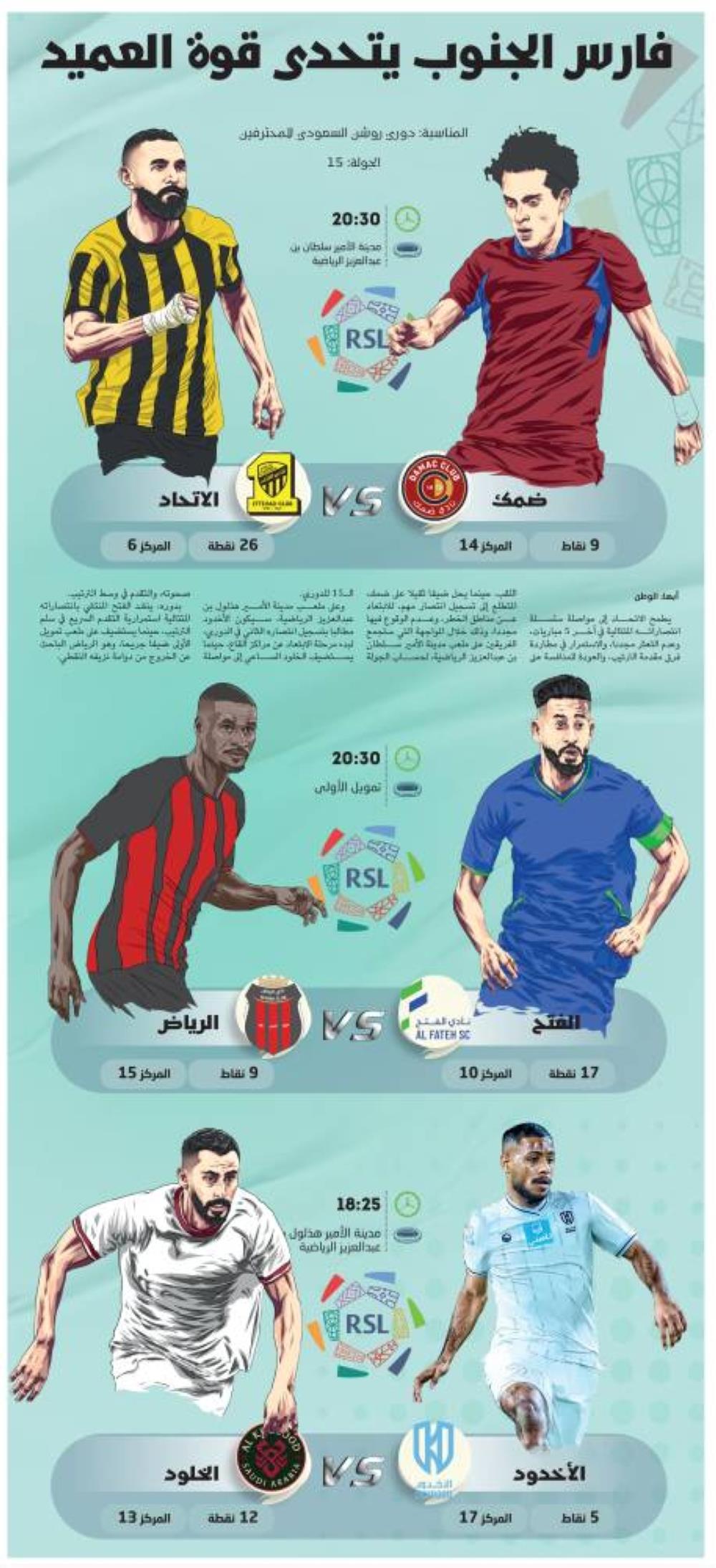 يطمح الاتحاد إلى مواصلة سلسلة انتصاراته المتتالية في آخر 5 مباريات، وعدم التعثر مجددا، والاستمرار في مطاردة فرق مقدمة الترتيب، والعودة للمنافسة على اللقب، حينما يحل ضيفا ثقيلا على ضمك، المتطلع إلى تسجيل انتصار مهم، للابتعاد عن مناطق الخطر، وعدم الوقوع فيها مجددا، وذلك خلال المواجهة التي ستجمع الفريقين على ملعب مدينة الأمير سلطان بن عبدالعزيز الرياضية، لحساب الجولة الـ15