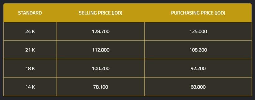 وبيّنت النقابة أن أسعار بيع الذهب سجّلت ارتفاعًا على مختلف العيارات، حيث بلغ سعر غرام الذهب عيار 24 نحو 128.7 دينارًا، فيما وصل سعر غرام عيار 21 إلى 112.8 دينارًا، وعيار 18 إلى 100.2 دينار، وعيار 14 إلى 78.1 دينار.