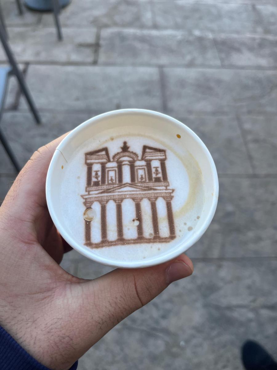عن طريق استخدام الرسم المطبوع الذي يتخصص الكافيه فيه, يمكنك اختيار الرسمة التي تريدها أكثر تعقداً من الرسم البشري: سيارة كلاسيكية من مجموعات المتحف, مشهد ساحر للبتراء, أو رسومات صغيرة لطيفة تجاذب إلى التصوير.