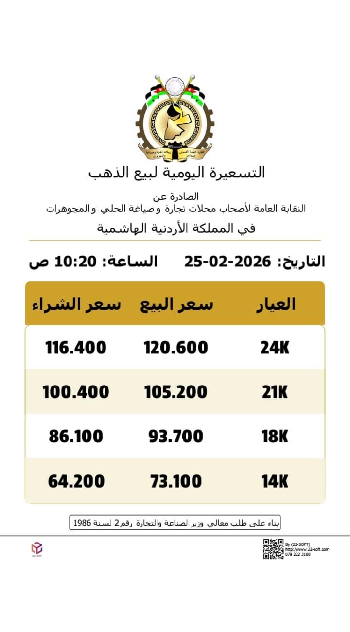 وبحسب التسعيرة المعلنة بلغ سعر بيع غرام الذهب من عيار 21 – الأكثر طلبًا في السوق المحلية – إلى 105.200 دينار، مقابل 100.400 دينار للشراء.