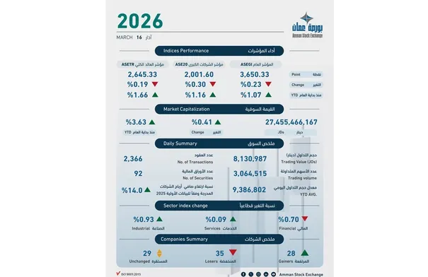وانخفض الرقم القياسي العام لأسعار الأسهم إلى 3650 نقطة، بانخفاض نسبته 0.23 بالمئة، إذ ارتفع الرقم القياسي في قطاع الصناعة بنسبة 0.93 بالمئة، وفي قطاع الخدمات بنسبة 0.09 بالمئة، بينما انخفض الرقم القياسي في القطاع المالي بنسبة 0.70 بالمئة.