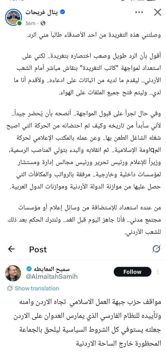وأكد فريحات وهو عضو كتلة حزب جبهة العمل الإسلامي في رده أن "حجم الاتهامات التي ساقها المعايطة لا يمكن اختصار الرد عليها بتغريدة بسيطة"، معلناً استعداده التام لفتح كافة الملفات وتقديم الإثباتات في مواجهة مباشرة، داعياً وسائل الإعلام ومؤسسات المجتمع المدني لاستضافة هذا اللقاء "اليوم قبل الغد" ليكون الحكم النهائي للرأي العام.