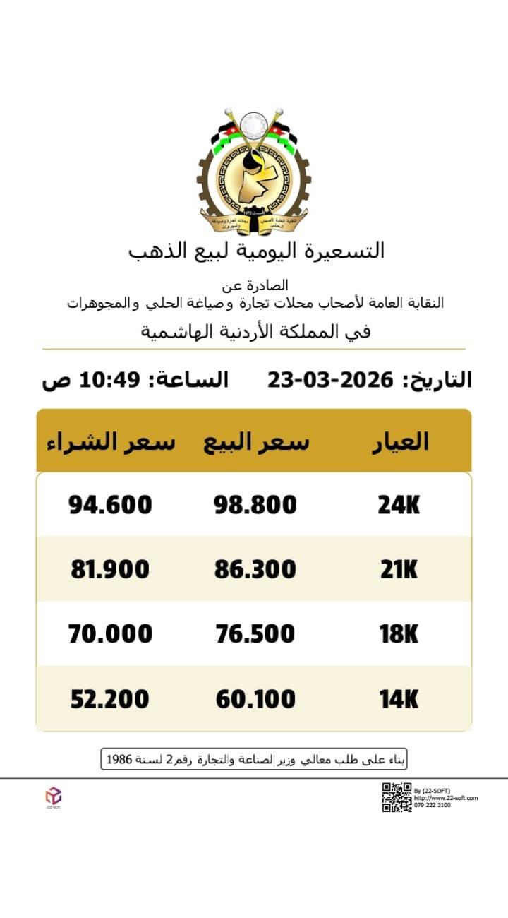 ارتفعت أسعار الذهب محليا، دينارين للغرام الواحد، في التسعيرة الثانية، وفق نقابة الحلي والمجوهرات.