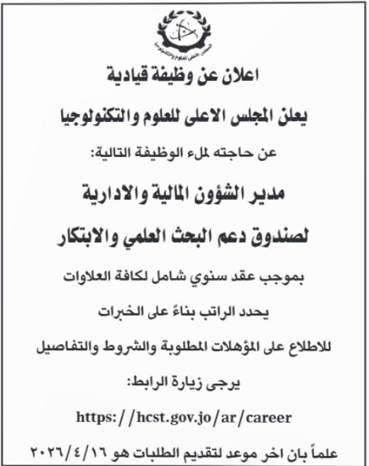(MENAFN- Al Wakeel News) الوكيل الإخباري- اعلن المجلس الأعلى للعلوم والتكنولوجيا، اليوم الاثنين، عن حاجته لملئ وظيفة قيادية شاغرة.