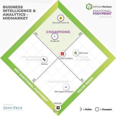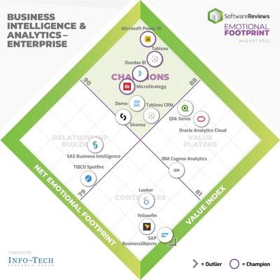 TORONTO, Aug. 10, 2022 /PRNewswire/ - SoftwareReviews , a leading source for insights on the software provider landscape, has published its 2022 Business Intelligence & Analytics Emotional Footprint , naming four top providers in the Enterprise and Midmarket spaces as Champions.
